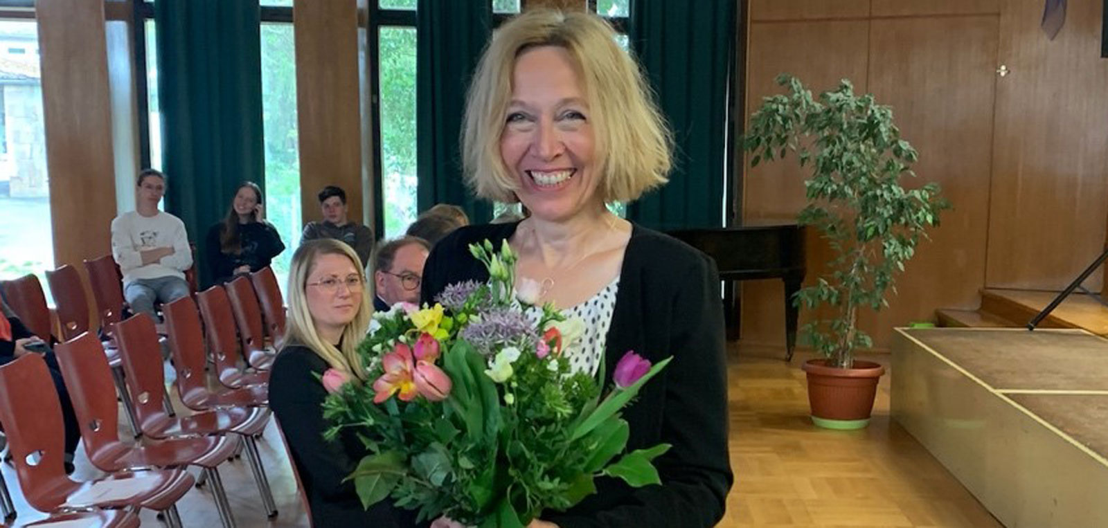 Dr. Brenner dankt für den „wunderbaren Empfang“, auch den Musikern wie ebenfalls den vielen anderen Angehörigen der Schulgemeinde. In ihren Augen sei die Rhenanus-Schule eine bunte, lebendige und tolerante Schule, die sich durch ein vielfältiges Miteinander von verschiedenen Begabungen auszeichne, was u.a. im Sport wie etwa auch in den Bereichen Musik und Theater deutlich werde.