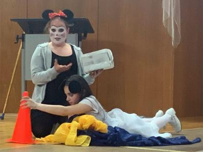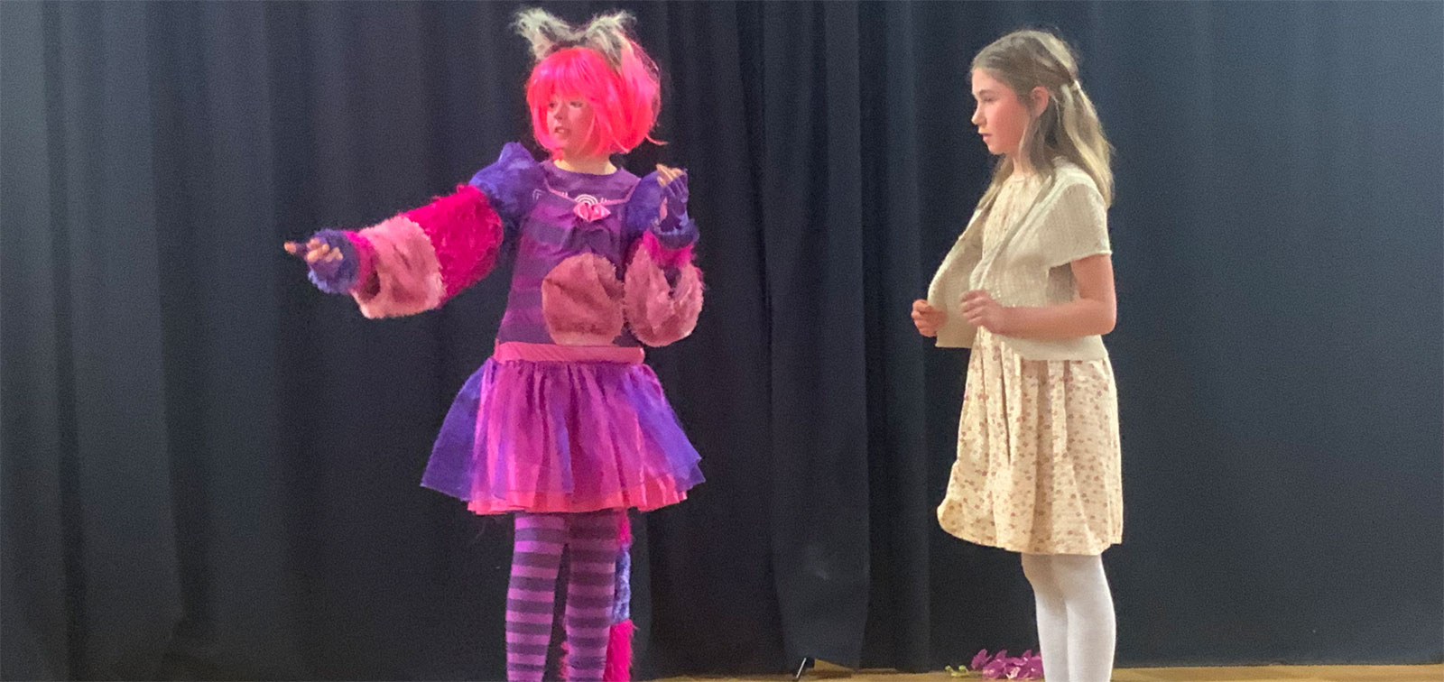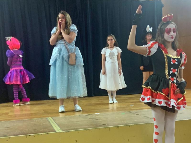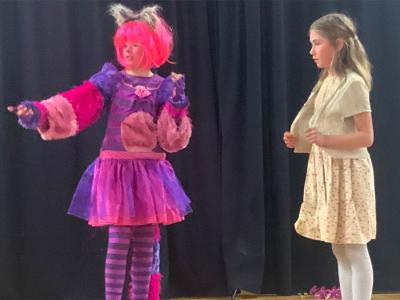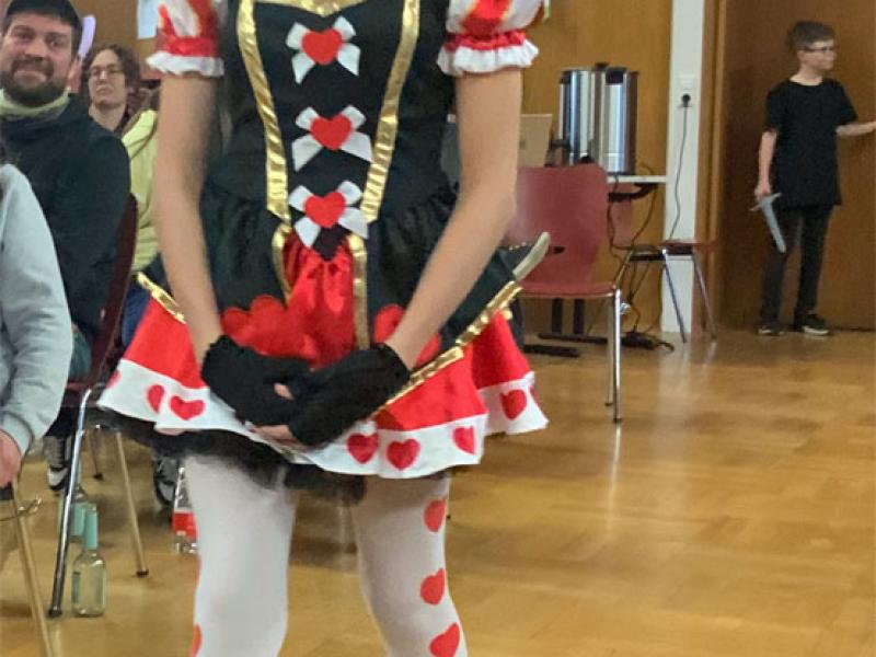 Einen der stärksten Auftritte hat Hannah Trube als wilde Waldhexe mit ellenlanger Nase und als Herzkönigin in ebenso spektakulärer Kostümierung. Hannah hat sich in der Stern-Truppe offenbar auf die Rolle der „fiesen Alten“ kapriziert und spielt dabei ihr mimisches Talent und ihre Bühnenerfahrung aus. Gebieterisch betritt sie den Saal und lässt bei der Gelegenheit gleich ein paar Wunderlandbewohner köpfen.