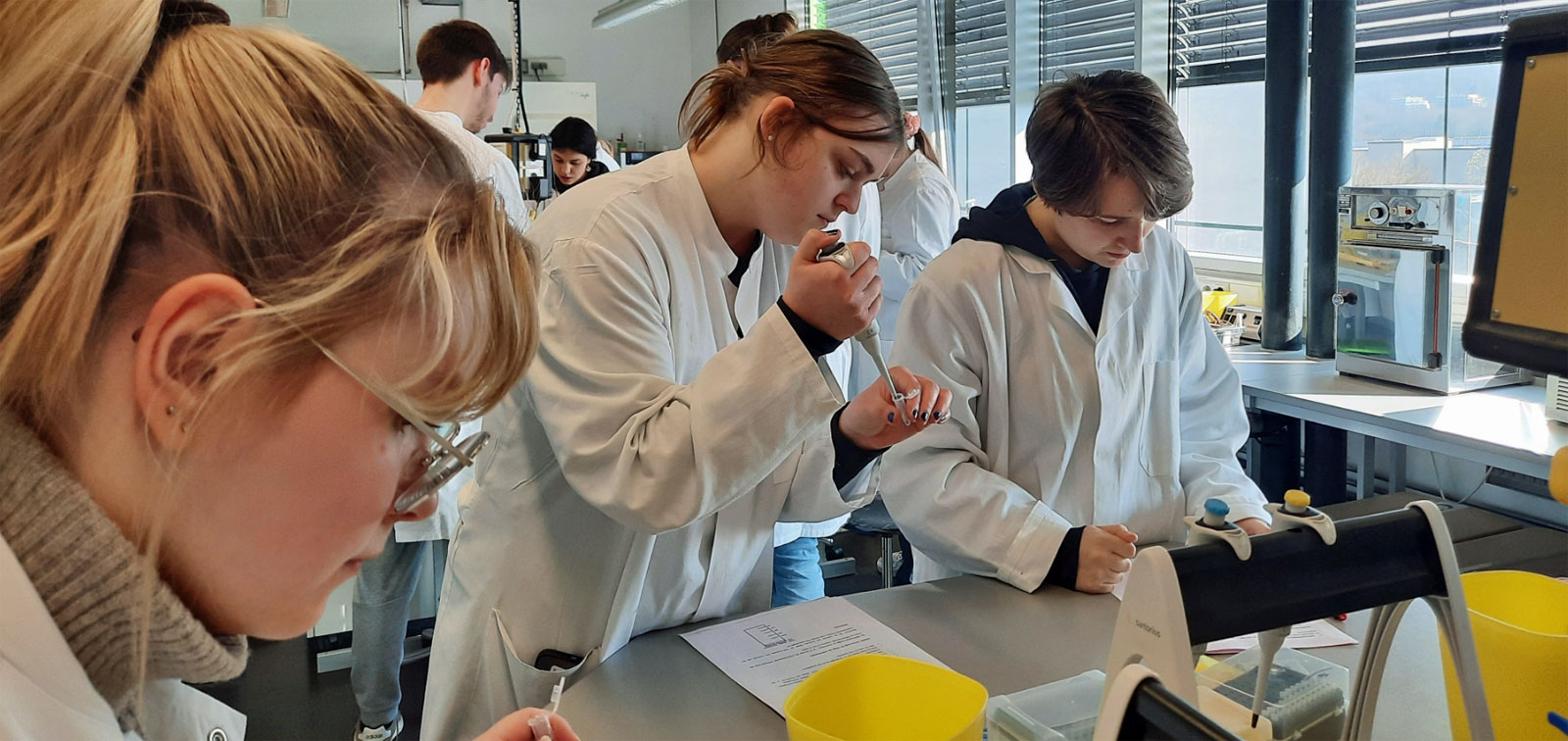 In einem intensiven Kurs erhielten die Schülerinnen und Schüler die Möglichkeit, ihre theoretischen Kenntnisse in die Praxis umzusetzen. Unter fachkundiger Anleitung arbeiteten sie im Labor und setzten die Inhalte ihres Unterrichts direkt in die Tat um. Sie isolierten die DNA ihrer Mundschleimhautzellen, vervielfältigen diese mit dem Verfahren der PCR (Polymerase Chain-Reaction) und machten die Banden ihrer DNA mit Hilfe einer Agarosegel-Elektrophorese sichtbar. Dabei war genaues Abmessen und vorsichtiges Arbeiten mit den für die Schülerinnen und Schüler teilweise unbekannten Instrumenten sowie ein gutes Maß an Feinmotorik gefragt.