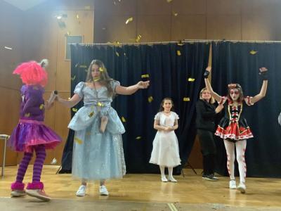 Einen der stärksten Auftritte hat Hannah Trube als wilde Waldhexe mit ellenlanger Nase und als Herzkönigin in ebenso spektakulärer Kostümierung. Hannah hat sich in der Stern-Truppe offenbar auf die Rolle der „fiesen Alten“ kapriziert und spielt dabei ihr mimisches Talent und ihre Bühnenerfahrung aus. Gebieterisch betritt sie den Saal und lässt bei der Gelegenheit gleich ein paar Wunderlandbewohner köpfen.