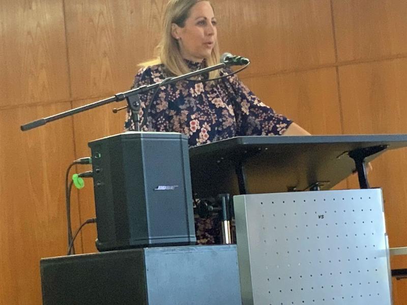 Mit den Worten „Habe Lampenfieber. War vielleicht keine so gute Idee, jemanden wie mich nach vorne zu schicken“, bewies Josephine Ziegler aus der R10 Souveränität und Situationshumor. Ihre Klasse habe gelernt, „in Krisensituationen zusammenzuhalten, obwohl wir sicher nicht immer die motiviertesten waren.“ In ihrer Erinnerung flögen im Chemieunterricht Korken über den Schulhof - und mancher Lehrer sei während der Experimente über auf dem Boden liegende Schüler gefallen. Sprüche ihres Klassenlehrers, Herrn Steinigk, wolle sie an dieser Stelle lieber nicht zitieren, schon um ihn vor Schwierigkeiten zu bewahren.