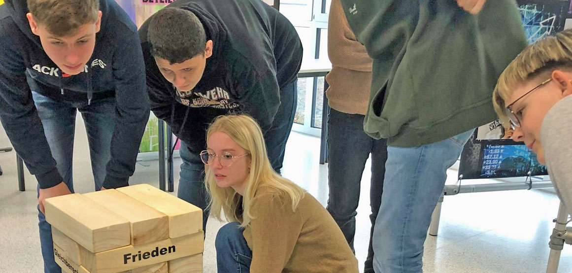 Da wird in Form eines Angelspiels der Einfluss der Medien auf die Meinungsbildung thematisiert. Ein Wackel-Turm aus vielen Holzklötzen mit Aufschriften wie „faire Wahlen“, „Meinungsfreiheit“ oder auch „Eigentum“ symbolisiert die Balance der Demokratie und macht im wörtlichen Sinne „begreifbar“, dass man keines ihrer Elemente entfernen darf, ohne Gefahr zu laufen, die Demokratie selbst zum Einsturz zu bringen. Bilder aus „Staatsformen, die es in Deutschland schon mal gab“ – von der Monarchie bis zur Diktatur – reaktivieren das historische Wissen der erfreulich gut informierten Neuntklässler und dokumentieren, welche verheerenden Folgen ein Flirt mit anderen Herrschaftsformen zeitigen kann.