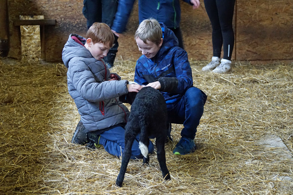 Danach erhielten die Schüler Zeit für die wirklichen Stars des Tages, die zu Beginn des Jahres geborenen Lämmer. Nach den ersten, vorsichtigen Kontaktversuchen, einem prüfenden Beschnuppern wurde im Stroh liegend schnell der kuschlige Kontakt gesucht.
