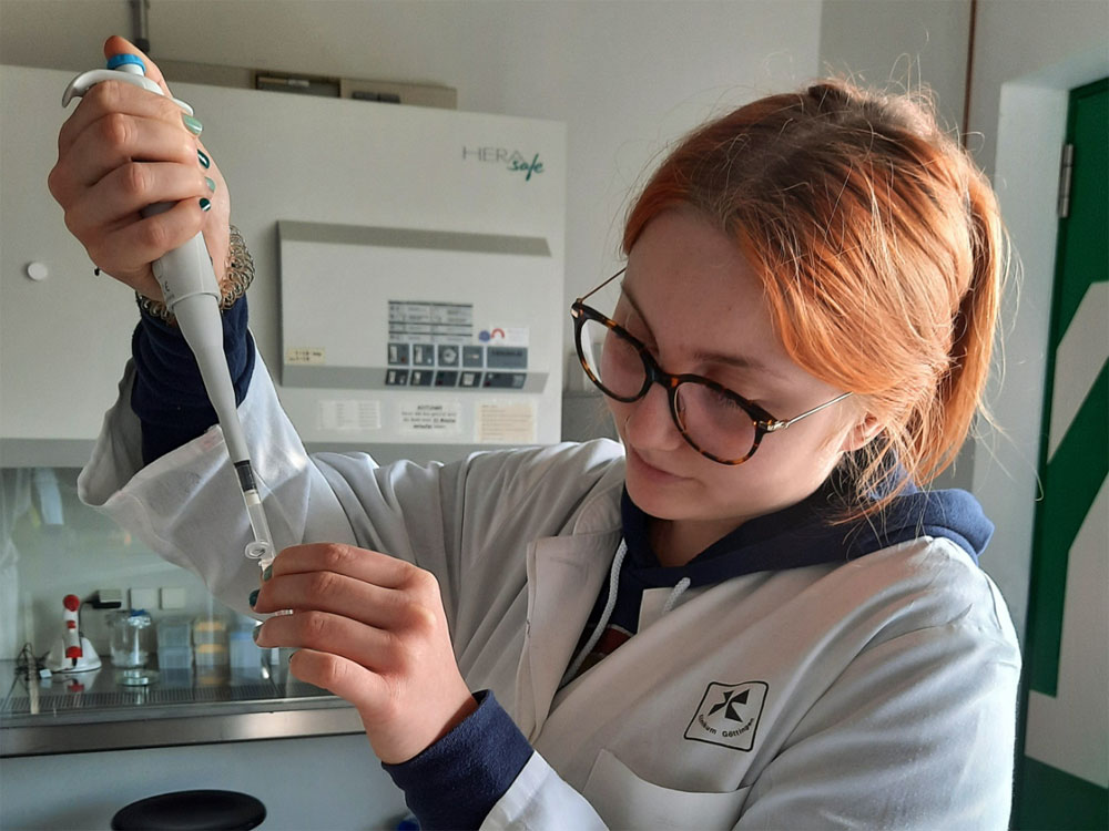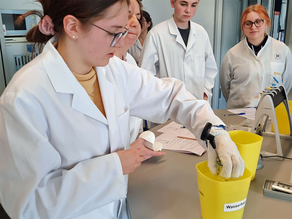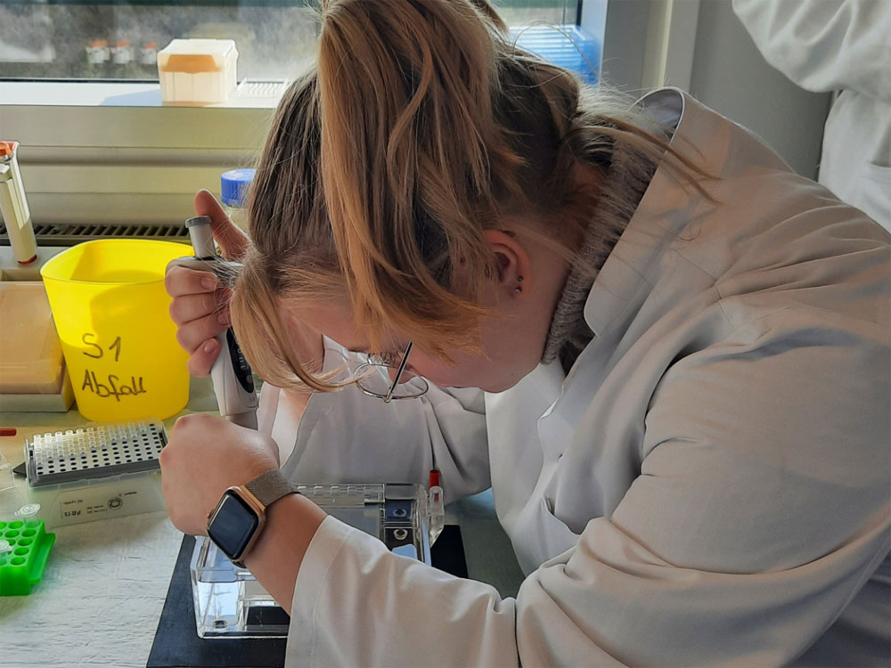 In einem intensiven Kurs erhielten die Schülerinnen und Schüler die Möglichkeit, ihre theoretischen Kenntnisse in die Praxis umzusetzen. Unter fachkundiger Anleitung arbeiteten sie im Labor und setzten die Inhalte ihres Unterrichts direkt in die Tat um. Sie isolierten die DNA ihrer Mundschleimhautzellen, vervielfältigen diese mit dem Verfahren der PCR (Polymerase Chain-Reaction) und machten die Banden ihrer DNA mit Hilfe einer Agarosegel-Elektrophorese sichtbar. Dabei war genaues Abmessen und vorsichtiges Arbeiten mit den für die Schülerinnen und Schüler teilweise unbekannten Instrumenten sowie ein gutes Maß an Feinmotorik gefragt.